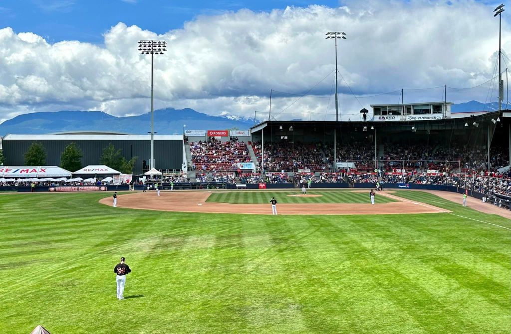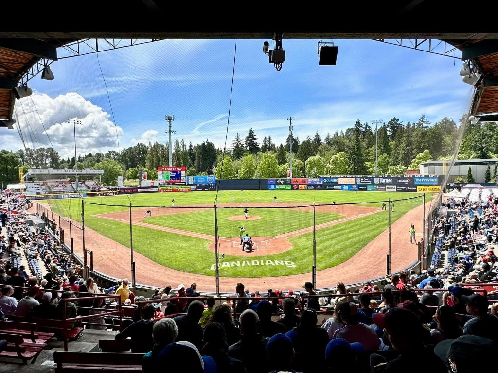 This was our third Northwest League game in three days and since there are only six teams in the league, we’ve now seen all of them. Nat Bailey Stadium is not quite in downtown Vancouver, and it’s fairly accessible. We did have to circle through the parking lot a couple of times before finding street parking pretty close by. The big issue is that the ballpark is right next to a rec center, and the nearest parking lot is reserved for people headed in to use the pool or ride the elliptical or whatever. But they don’t really TELL you this is the case until you’re stuck in that parking lot, by which time you pretty much have to circle slowly past the ballpark without actually being able to park. I suppose if you live here you know this. We did not know this.