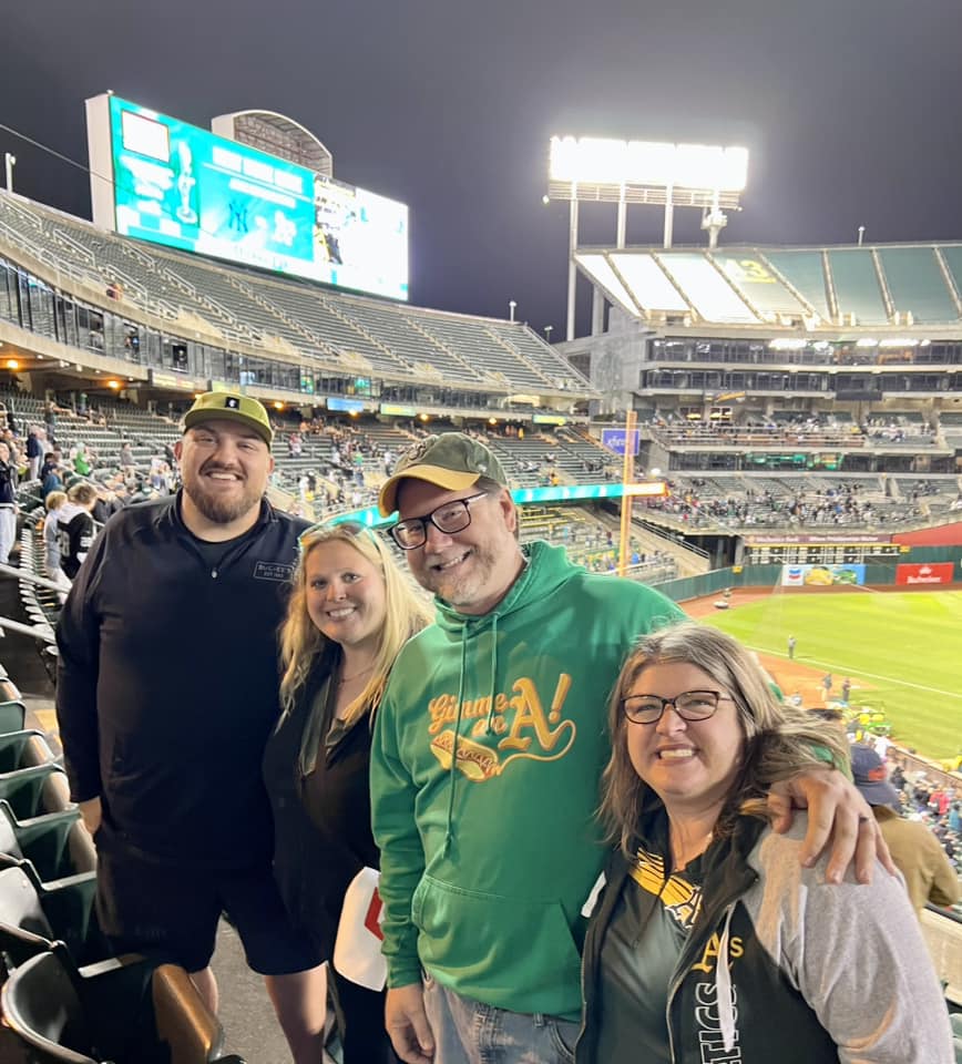 Last night we had some friends in from Michigan and decided to take them to the Coliseum; my friends Steve and Angie and their kids are here on a California journey with their two kids, and one of my wife’s former first grade students, Travis (from a quarter-century ago!) is here on a somewhat delayed honeymoon with his wife Haley. Both families just happened to descend on the Bay Area at the same time, so we grabbed eight tickets to go hang out; everybody had a blast and I had a chance to play Coliseum tour Guide, which I always enjoy. We even made it onto the JumboTron!