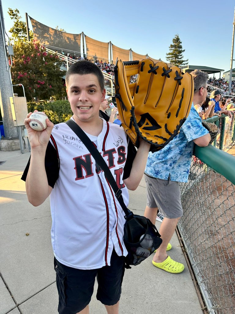 One super fan I met, a 22-year-old named Jordan, was there with the largest baseball glove I’d ever seen, so I felt compelled to wander over and say hello. He had three baseballs with him, one of which he had nabbed with his monster mitt earlier that day. He was having a blast clapping and yelling encouragement at his favorite team. We chatted and cheered for a bit and I asked if I could take his photo. “Sure,” he said. “I like you! You’re a nice guy!” He pointed out the autographs he had collected on his Nuts’ jersey, including his own on his left shoulder. He was a nice guy too. I like him!