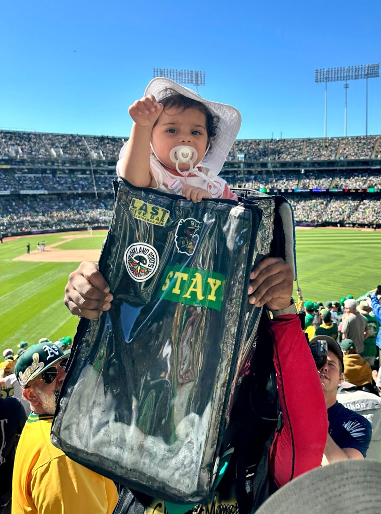 Mostly we talked to other fans as we slowly made our way toward the security tables. First we saw Jeff, who had not one but TWO giant foam hands with “OAK RAGE” printed across them. Another super cool guy, Glenn, actually said “Hey, are you Ten Stadiums?” which made me feel like a celebrity for a minute. We also chatted with the family behind us in the security line: Kimmy and Caleb and their son, Clayton, who have been coming to games since before he was born. They were awesome; Caleb was taking videos of various aspects of the exterior of the Coliseum and texting “remember this?” messages to his friends. Kimmy was telling us about how big a fan Clayton was. Clayton was mostly just sad. It broke my heart a little.